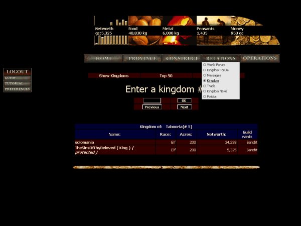 Kingdom shows your kingdom and who is in it. The name of the province, how many acres he/she has, which race they play, how much networth they have and how good a thief they are. As you see I am in protection mode right now, it will last for 24 hours so noone can attack me right away.