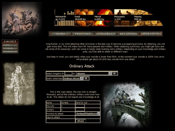 On the attackpage you choose wheater you want to make an ordinary attack for acers or an massacreattack just to harm. Massacreattack is not available before you get the proper knowledge for it. If you have little acres and the one you attack have many acres you will gain more acres than if you are the one with lots of acres attacking a small province.