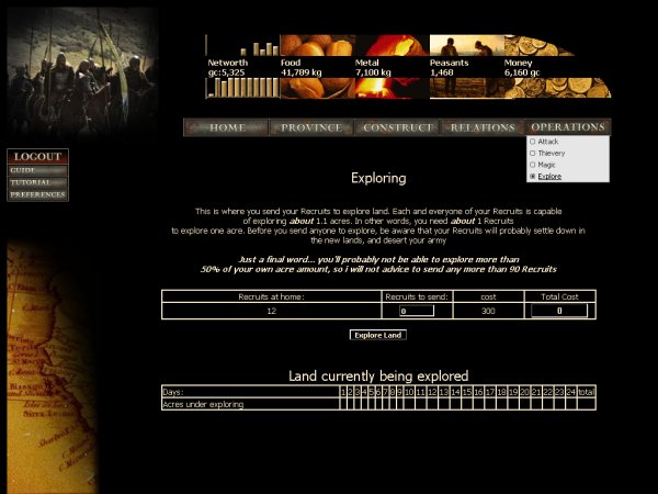 The explore-page is one of the most important pages in the start of the game. To grow you need acres. In the start it's hard to attack other players for acres, so you need to explore for them. Basicly what you need to do is to make recruits and send those recruits out in the world to discover new land for your province. In the beginning exploring will get you lot of acres, but after a while you need many recruits just to explore one lousy acres. Then it's time for your military and thieves to work together and give you targets for more land. Land is the essence of growth, but if you have very much land and very little military you will be attacked, and your precious land will be lost to your enemies.
