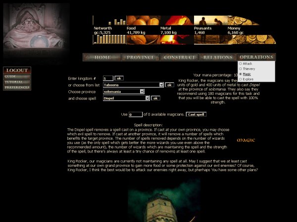 The magic page is where you make your wizards work for their living. You may cast spell on yourself, people in your kingdom and people in other kingdoms. Magic has many purposes, boost your income, harm other provinces, boost your kingdom mates income, protection against others and so on. Read about the spells available in the guide. If you want to be a great magician you need to have a big WPA/MPA (Wizards Per Acre/Magicians Per Acre) ratio so your spell will do the most harm/best boost.