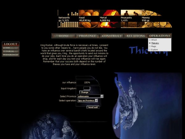 The thievery page is for thievery operations, this is where you go when you want to scan a province or rob his resources. Select the kingdom and then the province, and then the operation you want to be done. Remark, you need to have thieves for this to work :) If you want to be a good thief you need to have many many thiefes. A high TPA (Thieves Per Acre) is recommended so the operations you want to be done will be done succsesful.