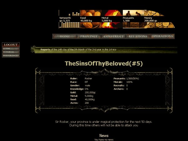 Now you have finally logged into the game. Now it is time to look around on the menu and get familiar with where things can be found. We will start on the left side. Logout logs you out of the game, tutorial leads to this page, and preferences are where you may change password and e-mailadress and such. I suggest that you change your password into something a bit easier... This is also the place where you may delete your province if you get tired of the game.