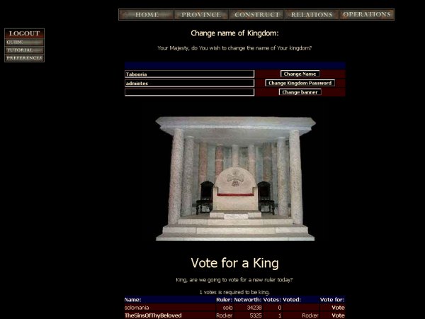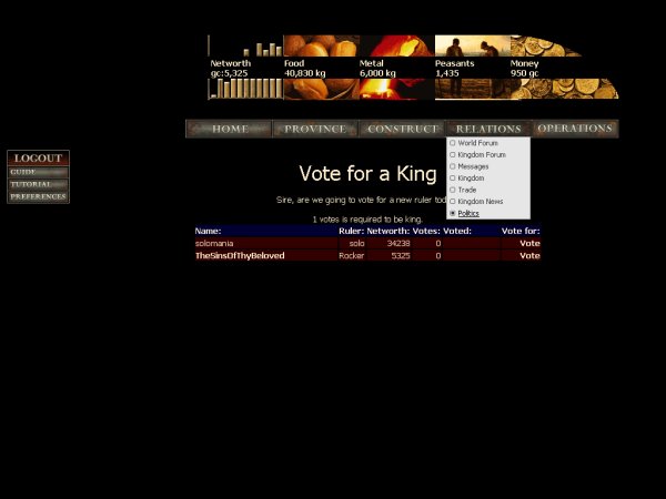 Here you may vote for king/queen. It should be someone with some diplomatic skills and the urge to abuse power. Heh. That's why I will vote for myselves!